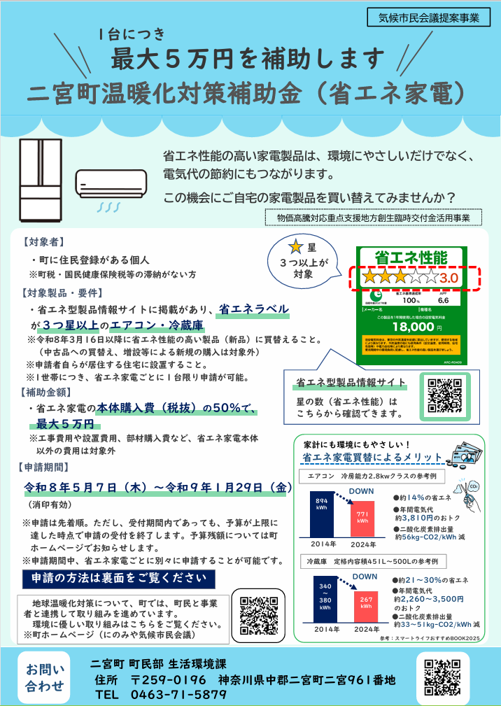 【二宮町】省エネ家電買替促進事業が発表!エアコン・冷蔵庫の購入費用に補助金が出ます!!