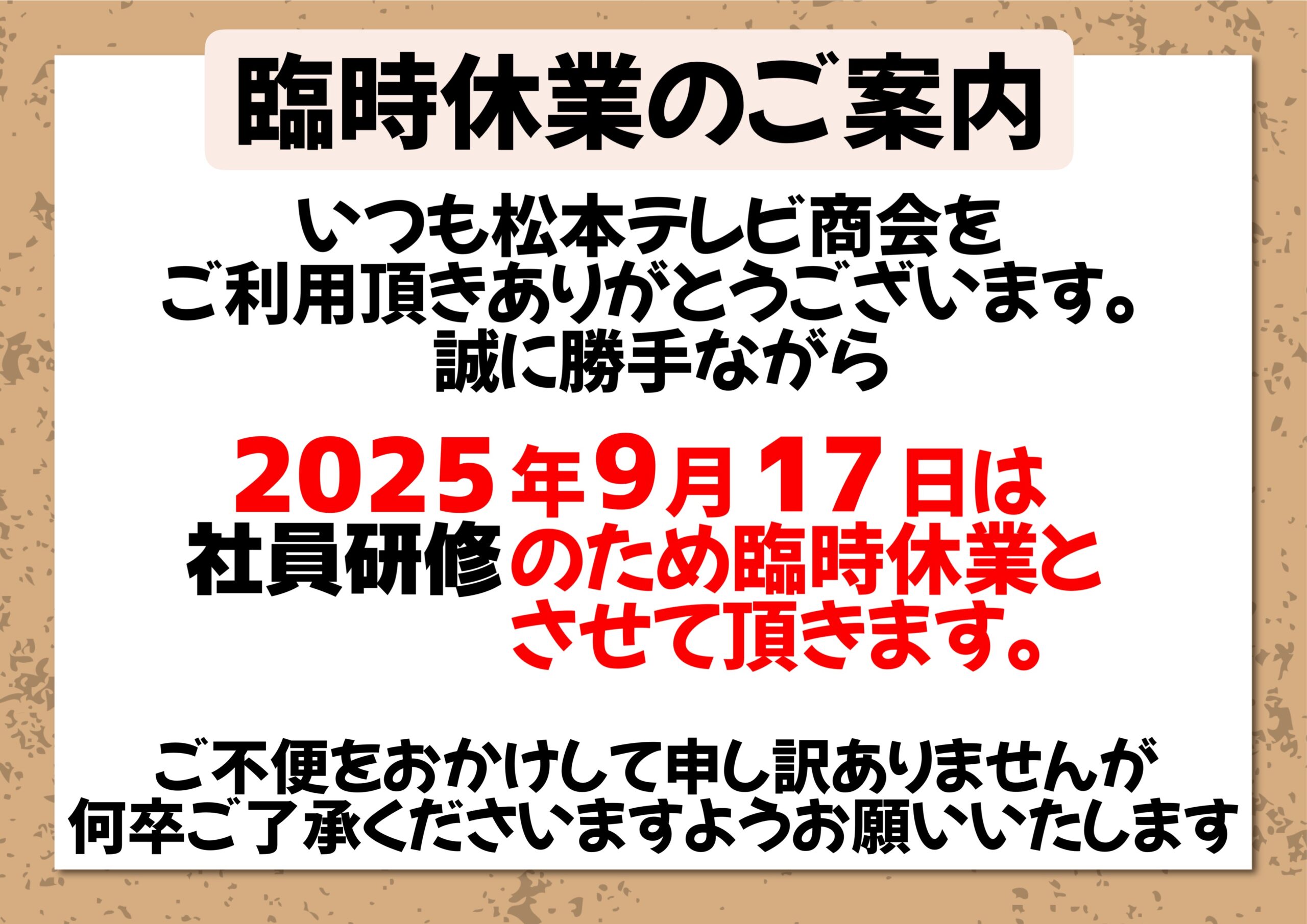 2025年9月17日(水)は、社員研修のため臨時休業とさせて頂きます。
