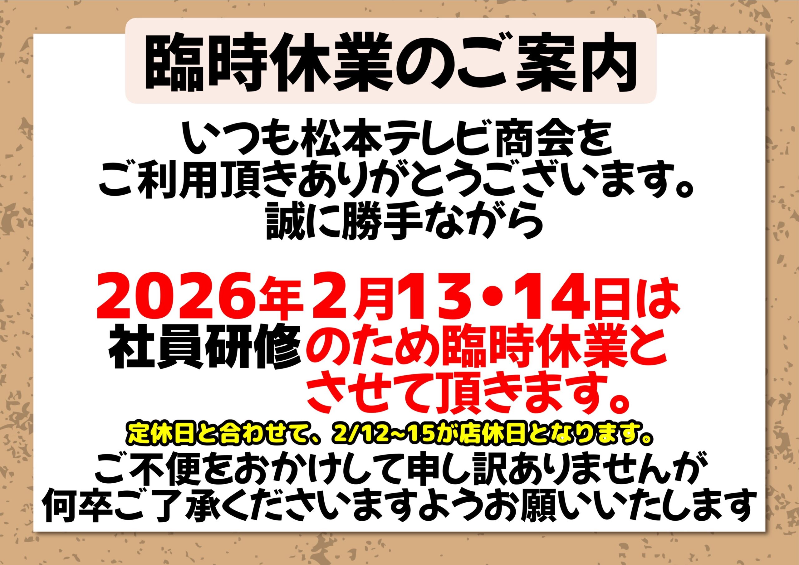 2026年2月13日(金)14(土)は、社員研修のため臨時休業とさせて頂きます。